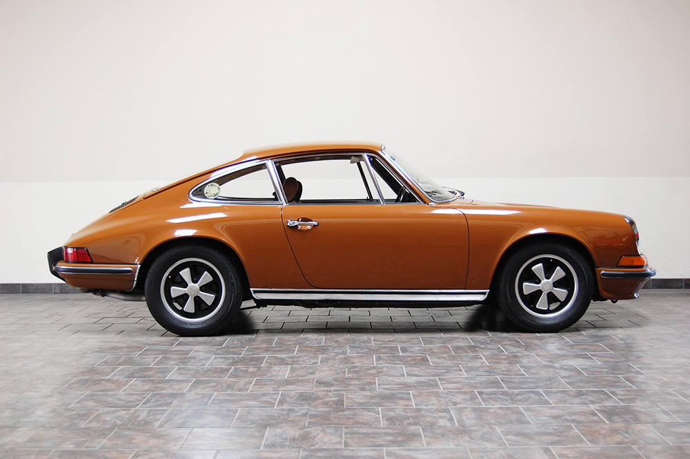 1973 911E Coupe in Sepia Brown with expected light patina. Very rare, low mile original paint, full numbers-matching with fresh engine overhaul due to long time original owner storage car with 87,000 documented original miles.