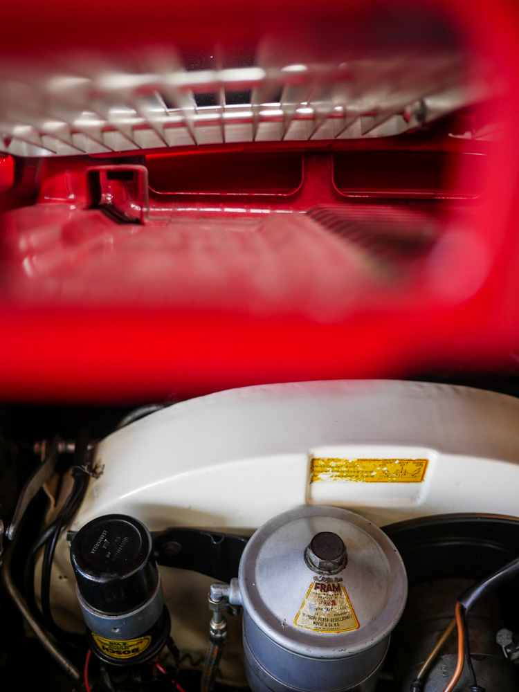 356 Cabriolets were exceedingly well-engineered- the top is well-insulated and well-trimmed while the doors and windows close snugly against the body and the seals of the top frame. On a warm day, one drops the top easily by unclasping three latches and with a single hand, folding the top into the rear of the car. Vent windows provide airflow, as the windshield and windows do an admirable job of reducing buffetting to an entirely comfortable level. On a cold day, one can nearly as easily raise the top, clasp the same three latches and merely turn a knob to pipe in air heated by its 1,582cc engine. The insulation level of the top makes this an all-season car, Porsche even showed Cabriolets with ski racks in its literature- they had no qualms about the ability of their cars to shrug off the elements and be used daily. The Cabriolets also had robust factory sound-deadening pads in the engine compartment to limit fan noise to a pleasant reminder of the method of engine cooling.