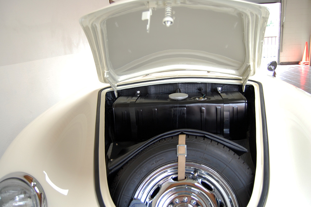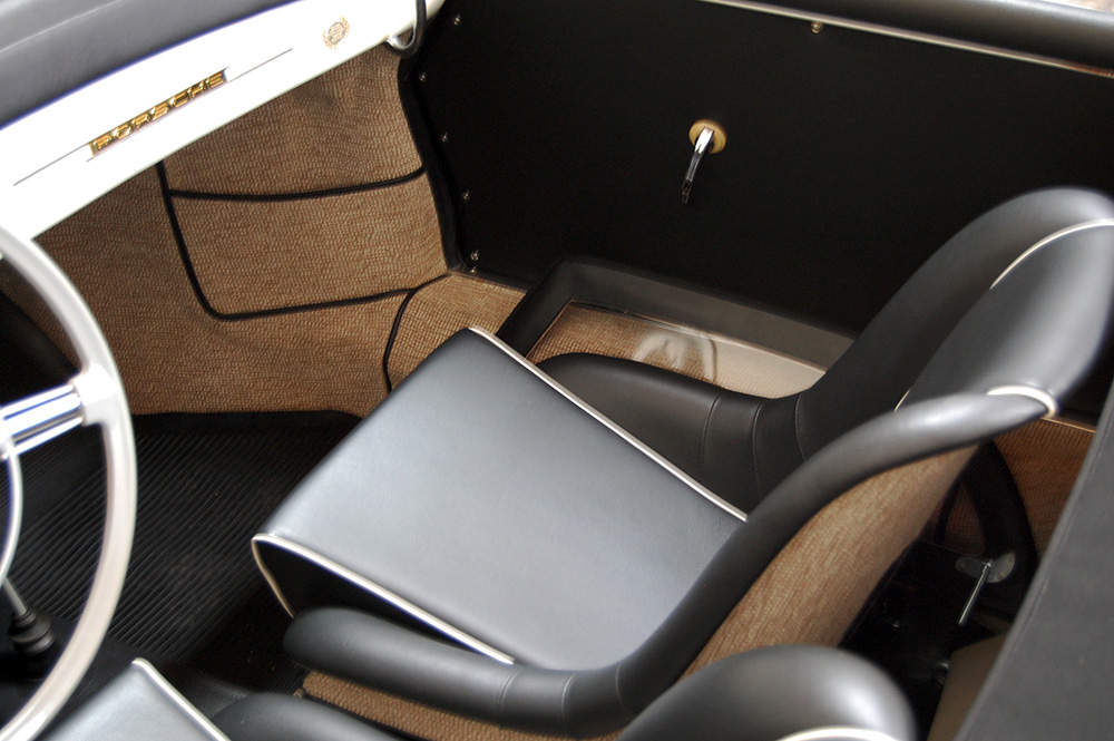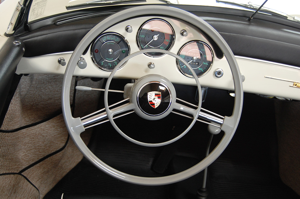 The floor and all of the body panels on this solid, rust-free example are original and retain their correct, factory matching numbers. The car was refinished in its original color combination of white and black leather Speedster seats, which are trimmed with white piping. The interior, including the boot and cover, the side curtains, and the correct, new German square-weave carpets, was handled by Thomas Pocious, and the dashboard instruments were rebuilt by North Hollywood Speedometer. Its original trim parts were restored by marque expert Victor Miles at Concours Refinishing in Ventura, California, and all necessary rechroming was done by the renowned Chris Hanson's shop in Los Angles, all in triple plate. The car was recently fitted with a set of period-dated (10-57), rebuilt, chromed Rudge knock-off wheels and hubs, which were an expensive factory option and are highly sought-after today. The previous owner stated that maintaining period authenticity was important, and "no stone was left unturned" in his pursuit of excellence.