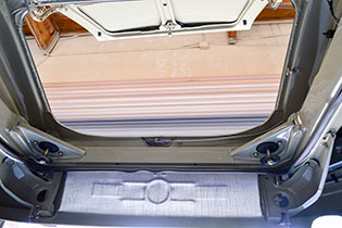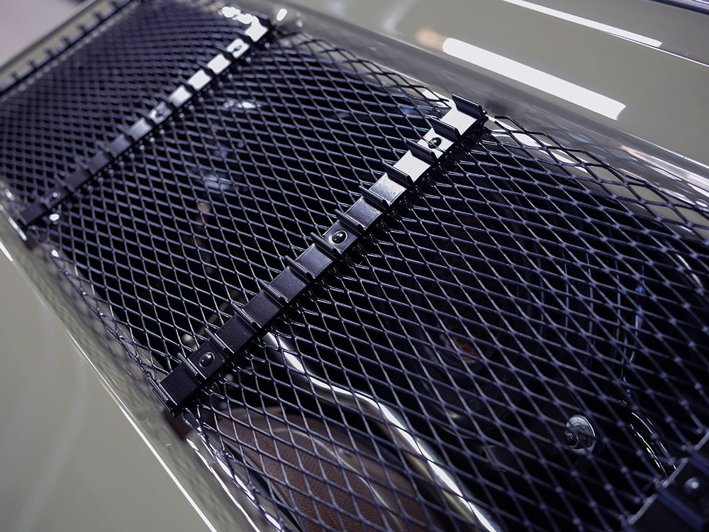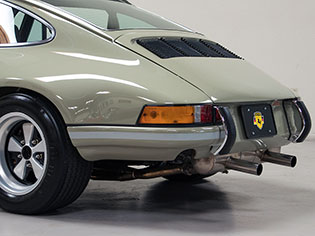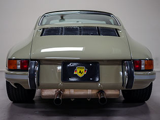 The factory steel bumper corners were also flared to match to rear quarter panels. The rear deck lid is aluminum alloy and its hinges have been extensively lightened. A 911 ST-style grille with no cross bars allows better airflow to the engine. Between the rear bumper corners is an alloy license plate panel framed by chrome bumper guards. 1973-specification European tail light lenses finish out the rear.