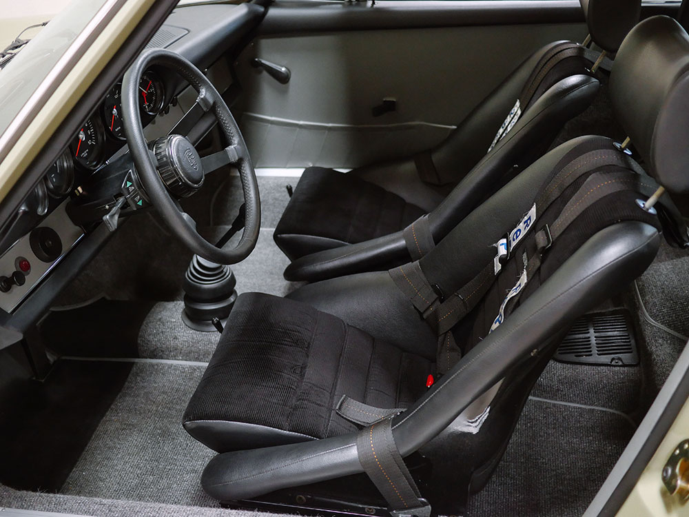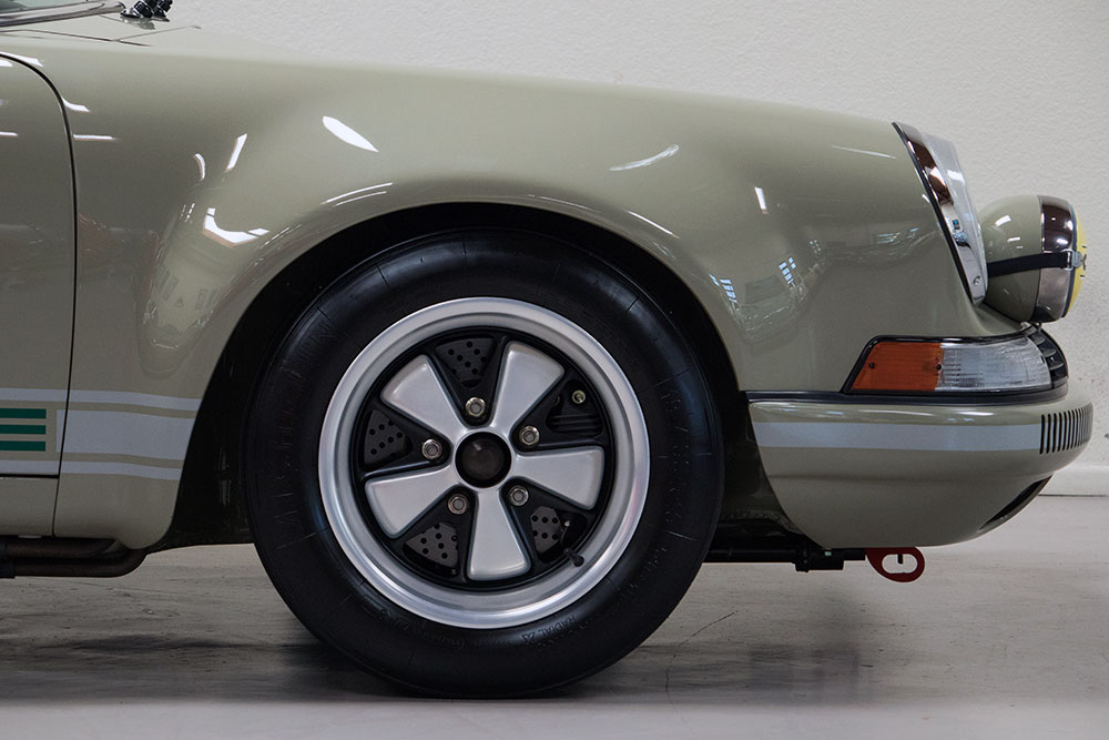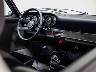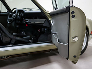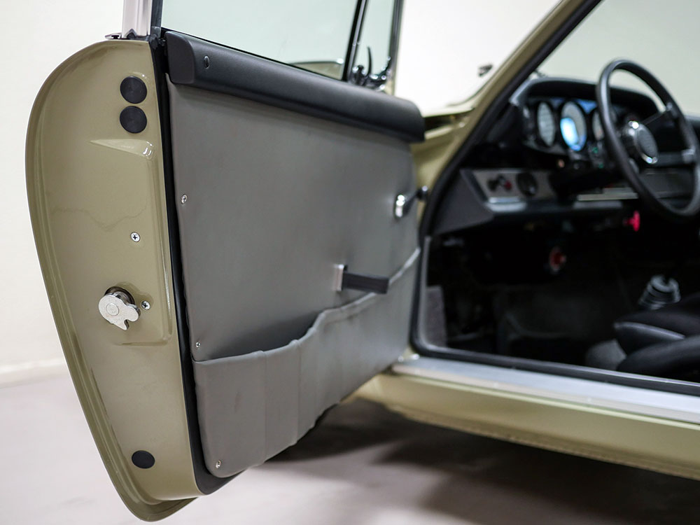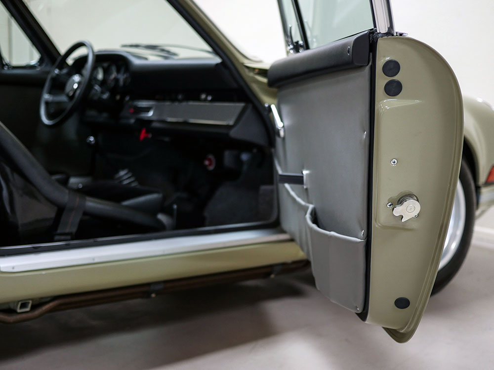 The unique interior was meant to be a more inviting place than a typical 911 interior. The seats are period Recaros with fresh corduroy in the centers mounted atop sliding mounts and bespoke brackets influenced by the RS Lightweight. Seat belts are period-style 3-point belts with recreation “Repa” tags. Once seated, the gray leather dash trim insert brings some lightness into your vision and transitions to gray leather door panels, which are modified versions of the 1967 panels with no armrests and a simple leather door pull framed by a machined aluminum escutcheon. The door toppers are modified 1968 examples, which are narrower and simpler than the stock items. The carpet is 356-style gray square-weave with gray leather edging. The rear seats and parcel tray were deleted. A replica Carrera RS 380mm steering wheel with “hockey puck” horn button provides steering interface. Instrumentation is stock with the exception of a 10,000 RPM tachometer, as outfitted to the factory racing cars.