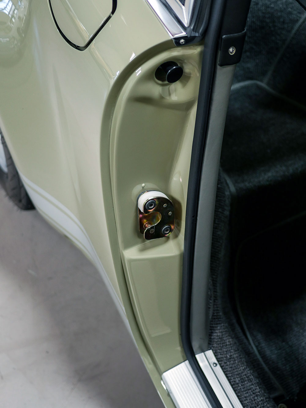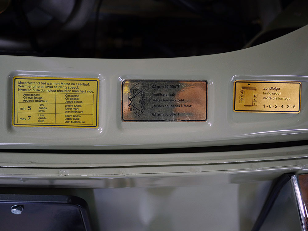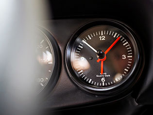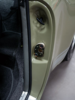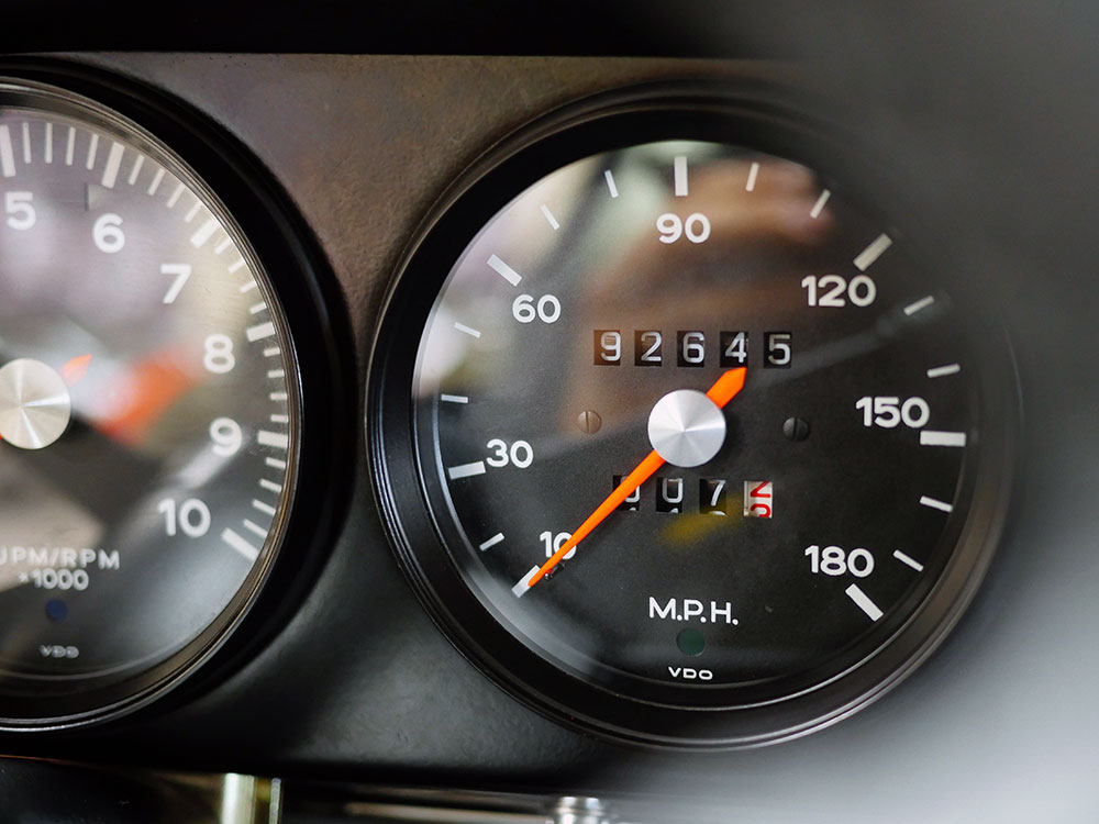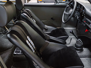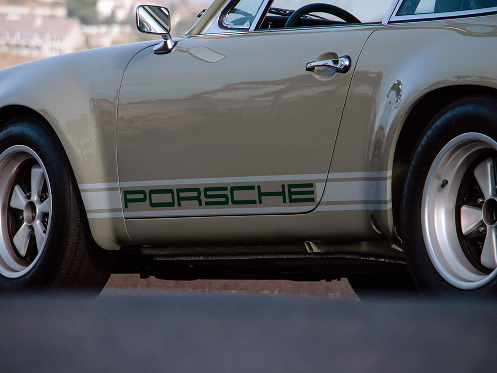 The unique interior was meant to be a more inviting place than a typical 911 interior. The seats are period Recaros with fresh corduroy in the centers mounted atop sliding mounts and bespoke brackets influenced by the RS Lightweight. Seat belts are period-style 3-point belts with recreation “Repa” tags. Once seated, the gray leather dash trim insert brings some lightness into your vision and transitions to gray leather door panels, which are modified versions of the 1967 panels with no armrests and a simple leather door pull framed by a machined aluminum escutcheon. The door toppers are modified 1968 examples, which are narrower and simpler than the stock items. The carpet is 356-style gray square-weave with gray leather edging. The rear seats and parcel tray were deleted. A replica Carrera RS 380mm steering wheel with “hockey puck” horn button provides steering interface. Instrumentation is stock with the exception of a 10,000 RPM tachometer, as outfitted to the factory racing cars.