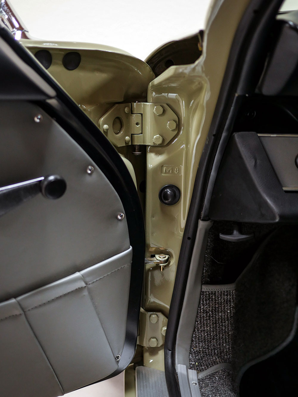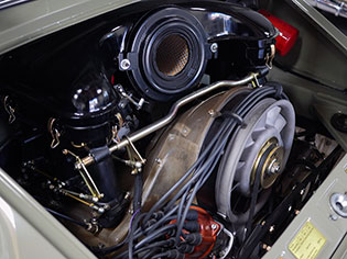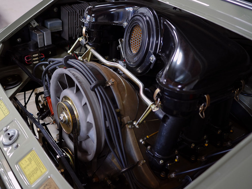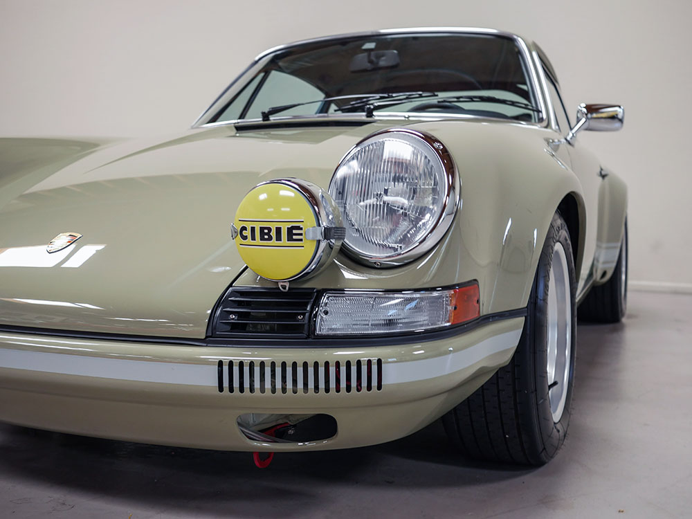The exterior is Stone Grey, a 356 A color that accentuates the ST-style steel flares on each corner. The factory steel front bumper was flared to match the front fenders and each cooling slot was cut by hand. Above the bumper are new-old-stock Cibié driving lights with covers inset of the H4 headlights and 1973-specification Italian turn signal lenses. The 1972 door trim was replaced with 1968 door trim with vent windows to increase airflow in the cabin without adding additional weight.