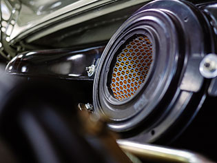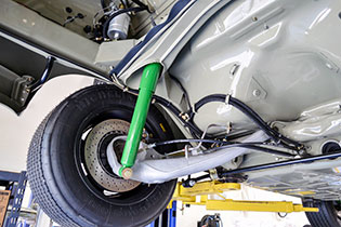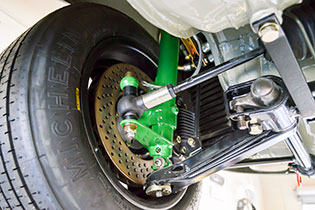 The suspension was an area where slight deviation was deemed necessary to deliver the road-holding and reliability demanded of modern custom builds. The front control arm and rear spring plate bushings are PolyBronze for a combination of ride quality and quick reflexes. The front control arm rear bushings are mounted in low-friction mounts to reduce suspension friction and increase damper effectiveness. Front upper mounts are spherical bearing camber plates to increase tire effectiveness and, despite their lack of bushing material, do not negatively affect ride harshness.