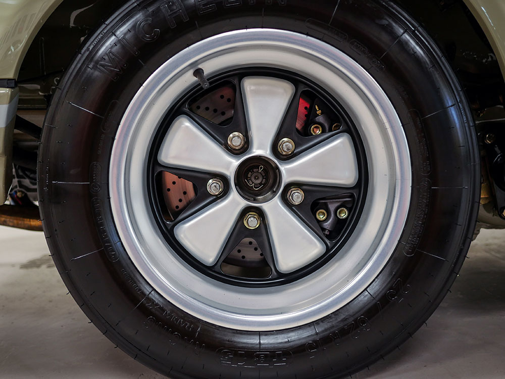 Braking is handled by a Zuffenhaus 917-style caliper setup utilizing 930 internals. Factory 930 pads give exceptional bite and modulation on the street and pedal feel is superb thanks to a larger bore master cylinder. Stainless "soft" lines add pedal feel and increase resistance to road debris damage.