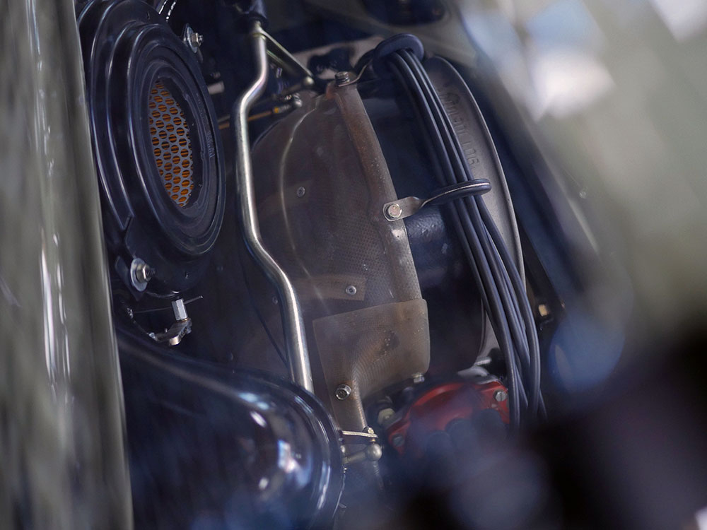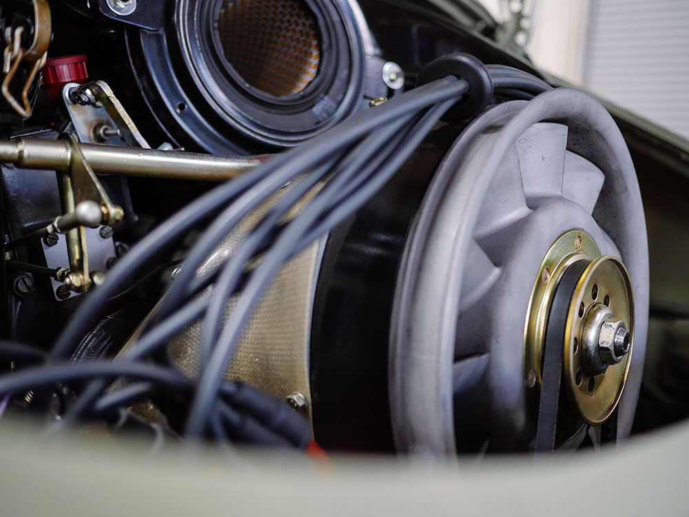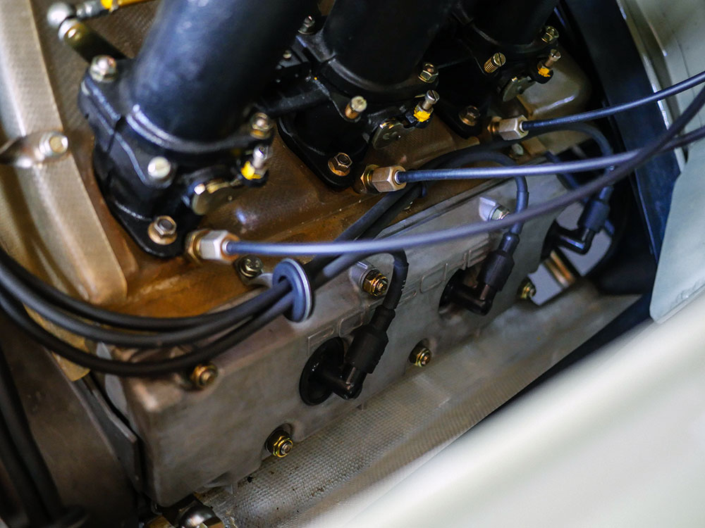 Keeping this fantastic engine cool is an Elephant Racing finned-line-and-twin fender-mounted oil cooler setup with through-body crossover lines. The engine shroud fiberglass and “tin” is German twill-weave, tinted similarly to the factory racing fiberglass, albeit with better fit and finish.