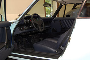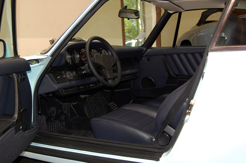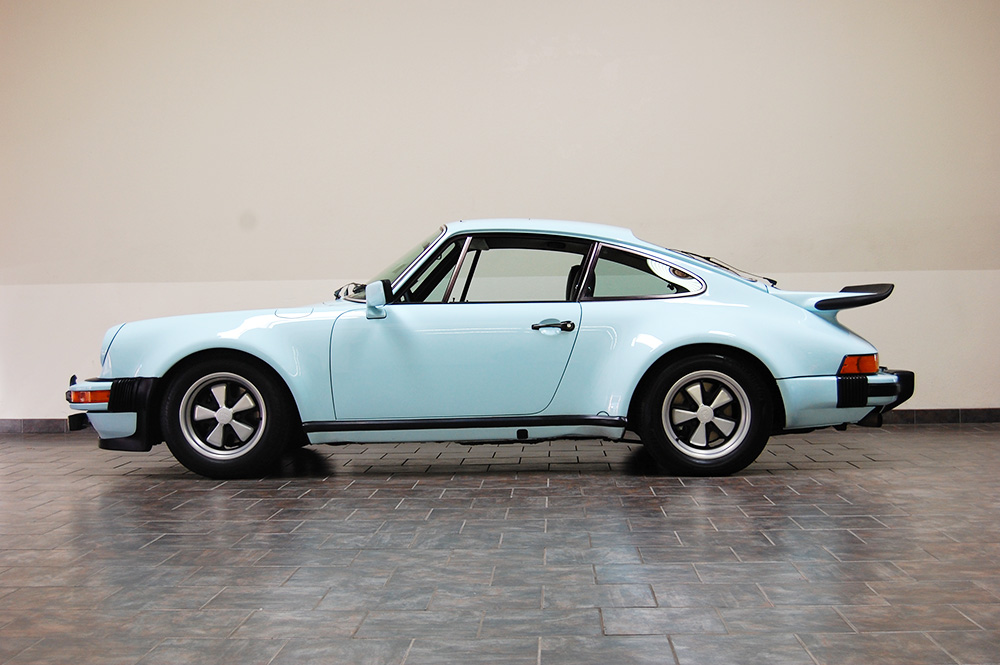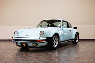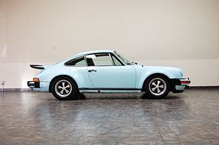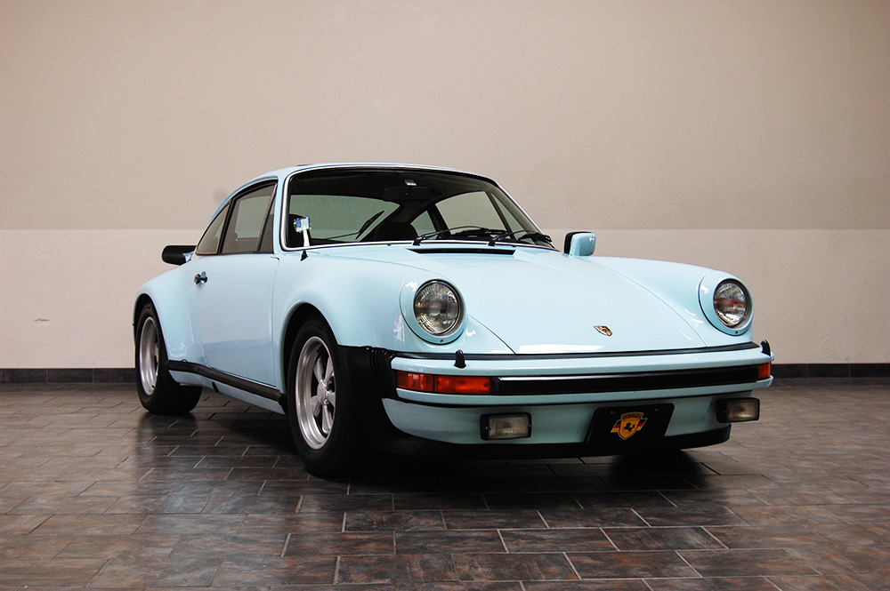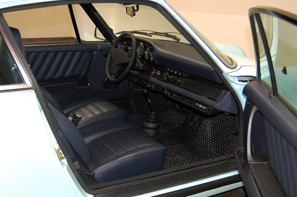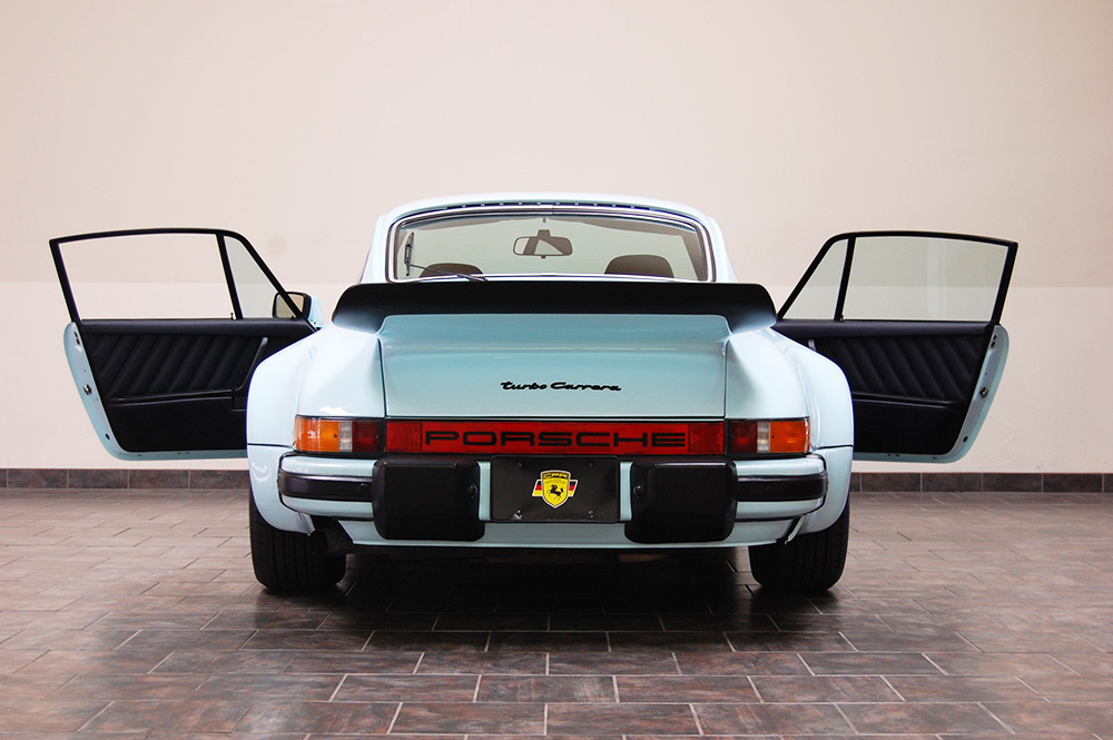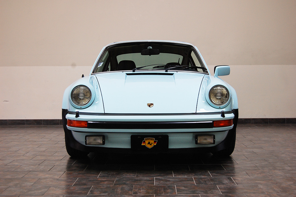 One of only 2 known to have been painted this color Polar Blue (also referred to as Ice Blue). This is a rare find indeed. Complete Original paint, fully numbers matching with original engine, transmission, all body panels, wheels, gauges correctly numbered. When the car came in we replaced the clutch, and it was the first time engine was removed from the car. What a pleasure to find a turbo which has never needed to be removed until the clutch! Major service including new hoses, new battery, restored wheels to factory new condition. Five new tires, new spare air pump. We sent the car to Tony Garcia who installed a complete, new all-German leather interior in Navy dark blue. This is hands down the finest original 930 Turbo it has been our pleasure to own in the last 30+ years. The car has 65,000 actual original miles documented. Comes with its original warranty and owners manual, jack and spare. Everywhere you look its original, no black out on the bottom just wonderful original paint. This car has never had any rust or paint work other then minor touch up and remains is showroom condition. Early Turbos are setting sales price records both here and in Europe. These cars are the true next evolution of the famous 1973 911RS Touring and light weight models of which 1581 were built for a perfect car commanding prices over 1 million dollars. If you are a serious collector this is a must for your collection. Sold. Click any image for a larger size...