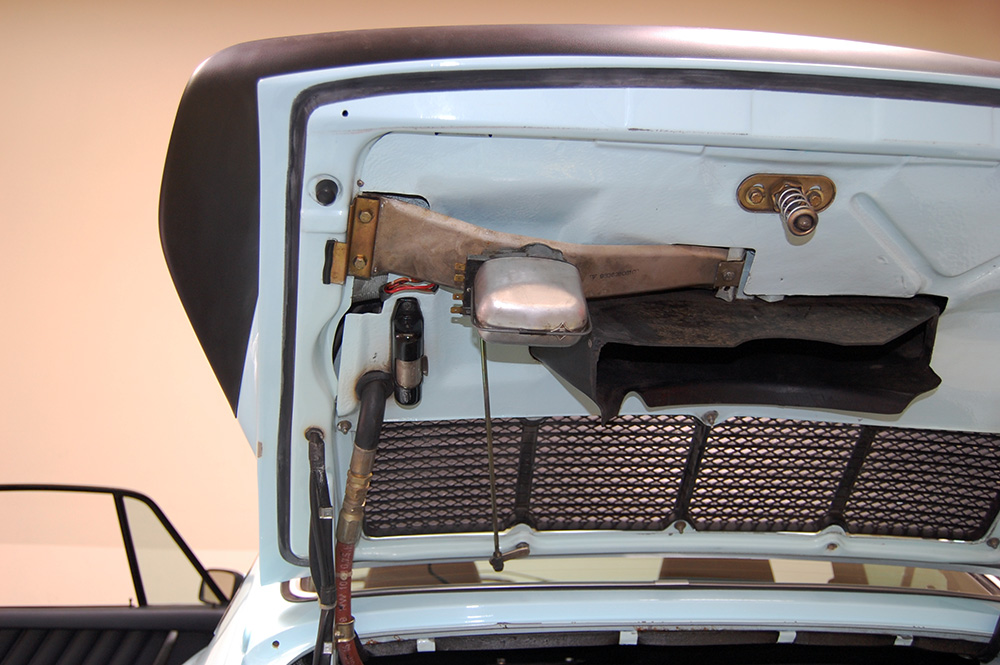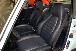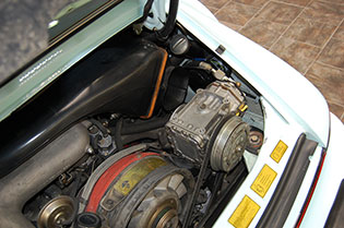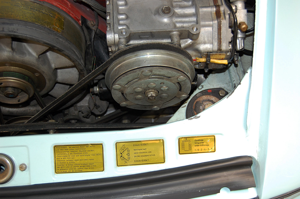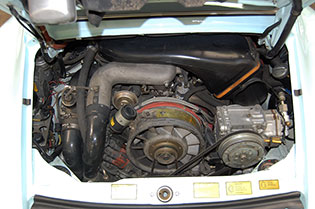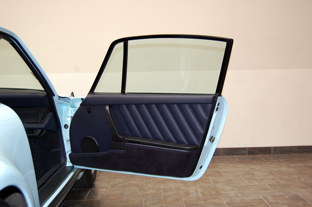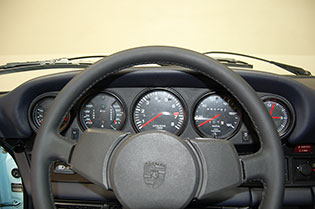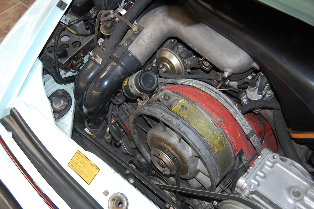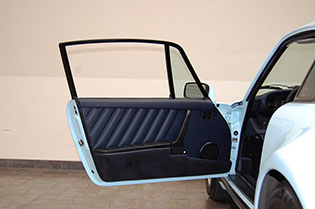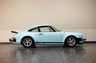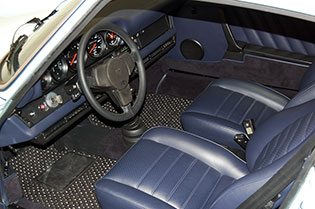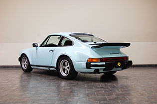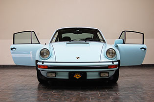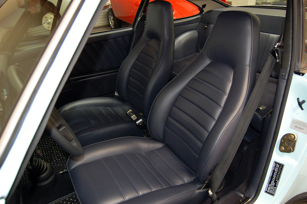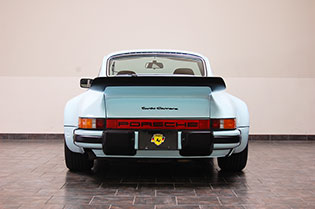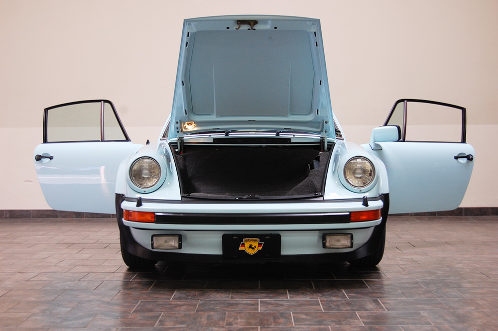 One of only 2 known to have been painted this color Polar Blue (also referred to as Ice Blue). This is a rare find indeed. Complete Original paint, fully numbers matching with original engine, transmission, all body panels, wheels, gauges correctly numbered. When the car came in we replaced the clutch, and it was the first time engine was removed from the car. What a pleasure to find a turbo which has never needed to be removed until the clutch! Major service including new hoses, new battery, restored wheels to factory new condition. Five new tires, new spare air pump. We sent the car to Tony Garcia who installed a complete, new all-German leather interior in Navy dark blue. This is hands down the finest original 930 Turbo it has been our pleasure to own in the last 30+ years. The car has 65,000 actual original miles documented. Comes with its original warranty and owners manual, jack and spare. Everywhere you look its original, no black out on the bottom just wonderful original paint. This car has never had any rust or paint work other then minor touch up and remains is showroom condition. Early Turbos are setting sales price records both here and in Europe. These cars are the true next evolution of the famous 1973 911RS Touring and light weight models of which 1581 were built for a perfect car commanding prices over 1 million dollars. If you are a serious collector this is a must for your collection. Sold. Click any image for a larger size...