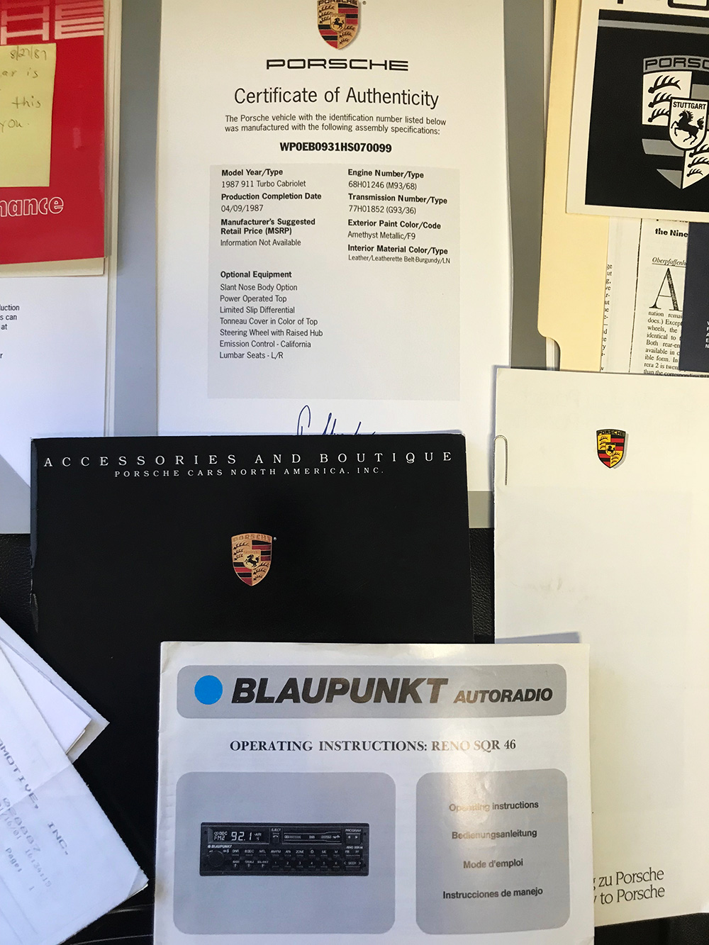 The car is heavily documented since new including a document spelling out the original owners itinerary when he took European delivery before sending the car home to California. Photos of the itinerary along with many of the other documents are in the gallery. The car also retains virtually every service record since new as well as its owner’s and service manual, and multiple brochures and tour documents from the original owner’s Stuttgart delivery. Also included are numerous registrations, all sets of original keys and the car’s complete toolkit.
