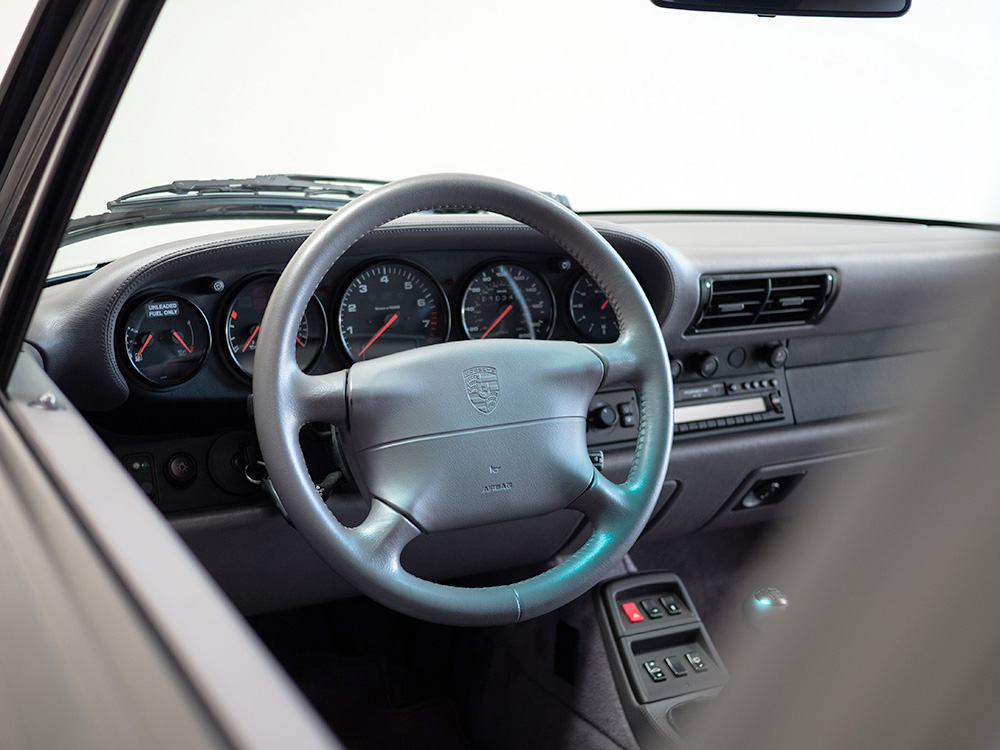 This 993 Turbo is without a doubt the most original, well-preserved example we have ever acquired. The car is 100 percent original in every regard. The paint measures at factory thickness across the entire car. The interior is all original with perfect carpet, dash, gauges, headliner and beautifully preserved seats with virtually no stretching of any kind.